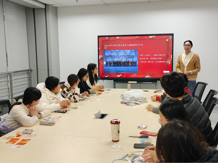 活动伊始,支持人以APEC峰会领导人服装面料为切入点,让同学们深入了解了宋锦“华而不炫,贵而不显”的特质,以及“通经断纬”织造工艺背后的匠心精神。在手工制作环节,大家细心裁剪布料,专注压实包边,将传统纹样与青春寓意相结合。