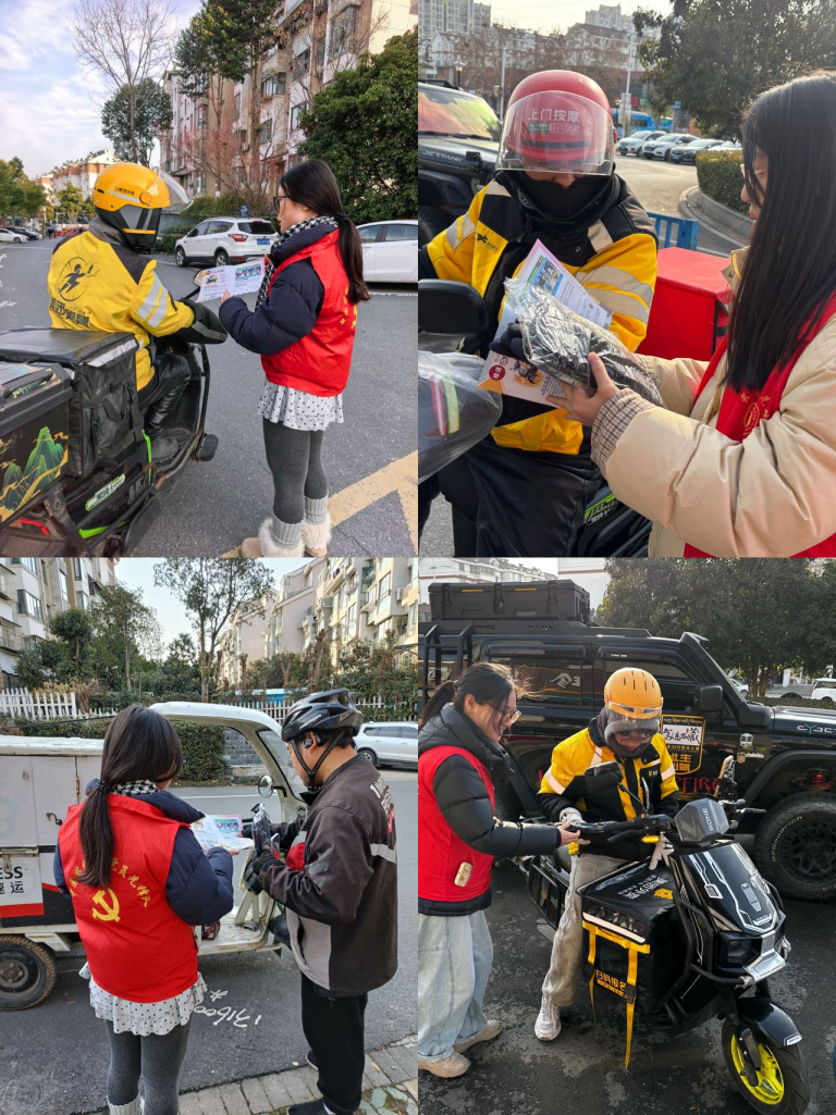 活动当日,生科院长青党员先锋队的研究生党员志愿者们身着鲜艳的红马甲,精神饱满地投身志愿服务。他们在小区的不同入口处合理设置服务点,形成全方位的服务网络。每当有快递员、外卖配送员、网约车司机等群体路过,志愿者们便热情地迎上前去,为他们递上防寒慰问物品,让他们在寒冷的天气中感受到丝丝暖意;同时,还发放安全宣传资料,耐心讲解安全知识,提醒他们在忙碌的工作中注意自身安全。